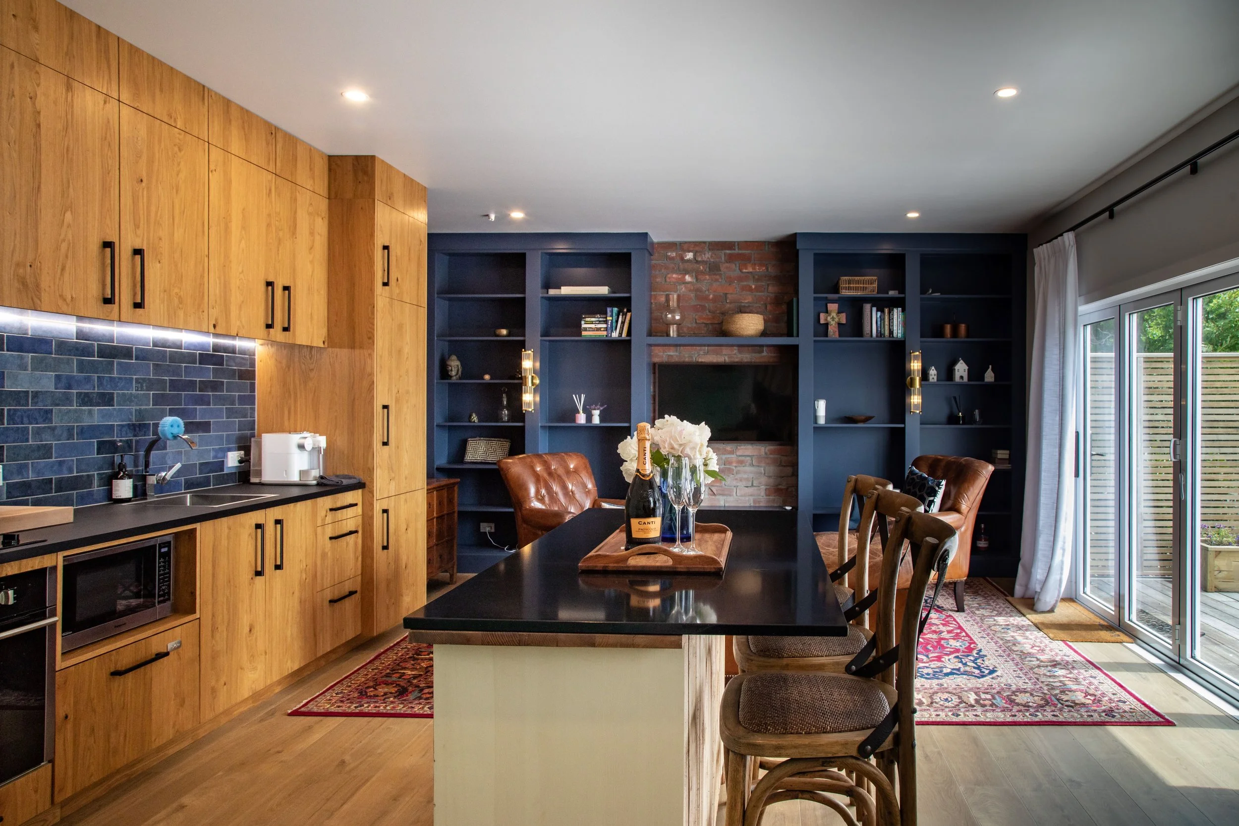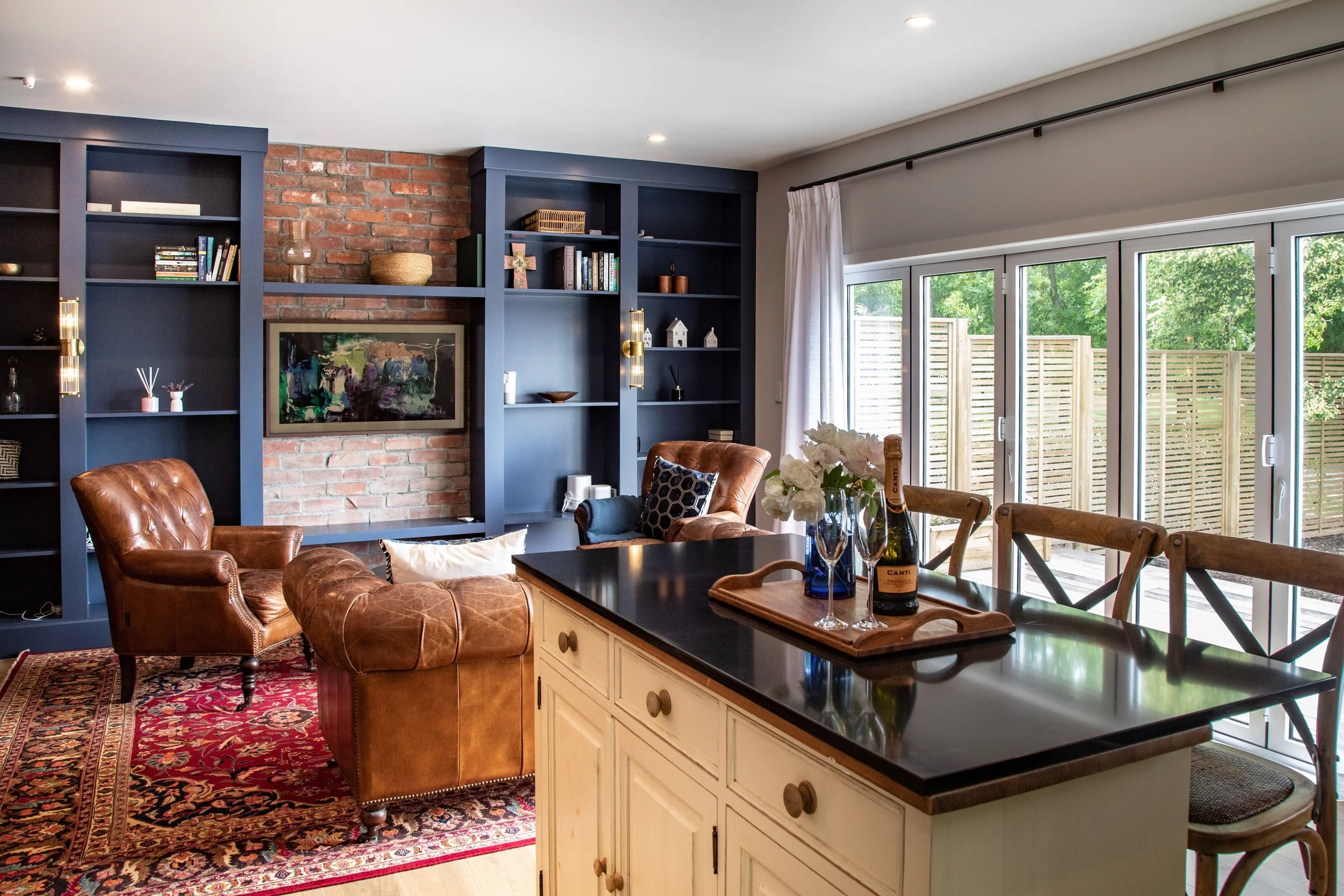 Ground Floor: Full kitchen with breakfast bar dining | Adjoining lounge complete with Chesterfields & large panoramic doors opening directly onto the deck | Sonos sound and Flatscreen TV | Laundry room | Toilet and Shower